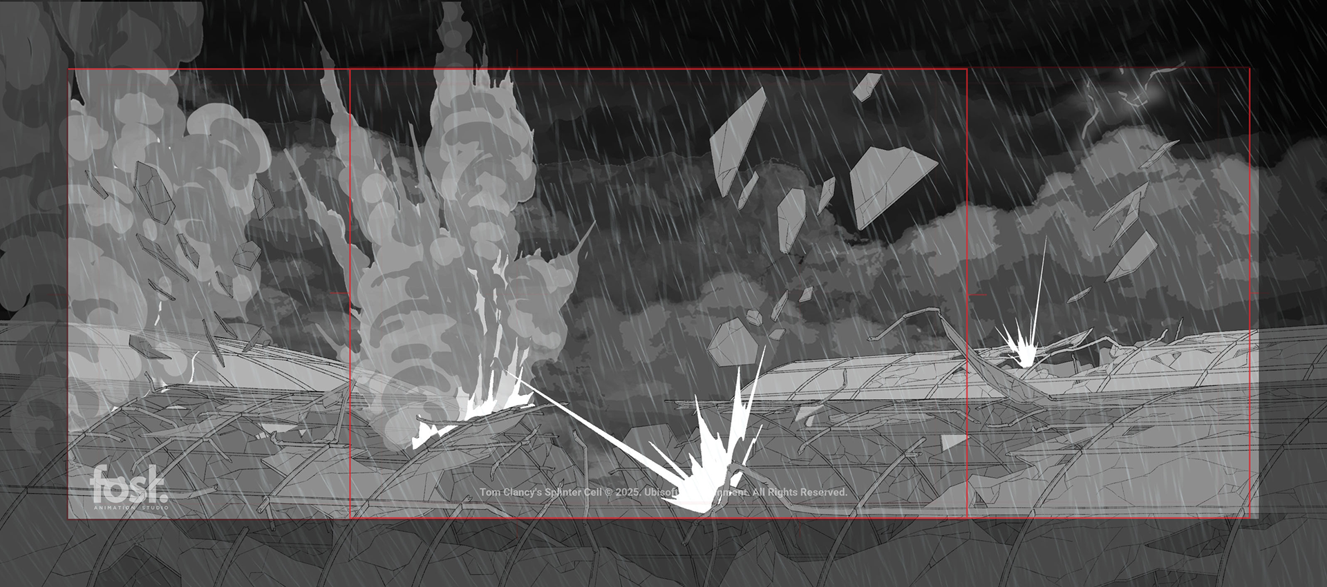I worked on this project for Netflix as a layout artist at FOST studio in 2023–2024. A anime series adaptation of the video game "Splinter Cell" produced by Ubisoft Film, directed by Guillaume Dousse and Félicien Colmet Daâge, with Benjamin Loirat as lead line artist.